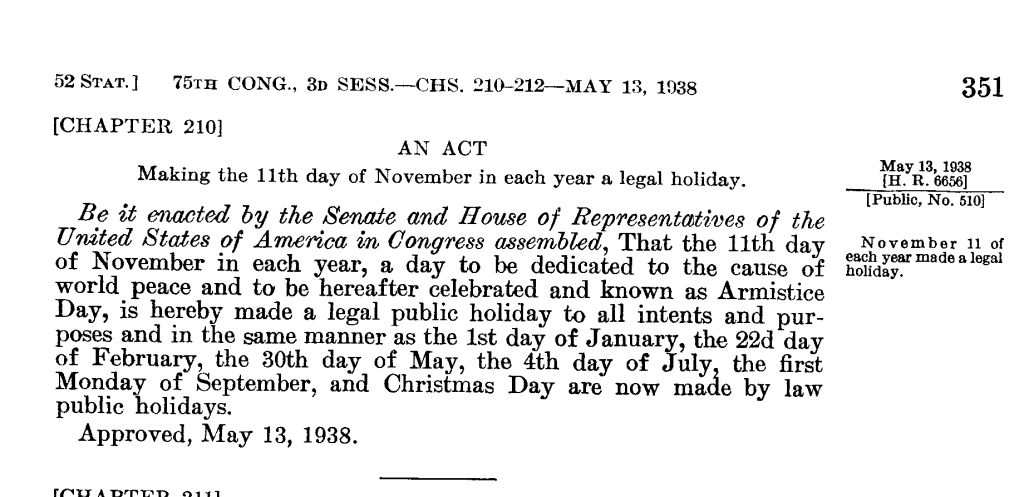 One year later, Woodrow Wilson would urge Americans to remember solemnly those lost in the war, officially observing for the first time the anniversary of the war’s end. On May 13, 1938, Congress would officially recognized November 11th to be an official holiday