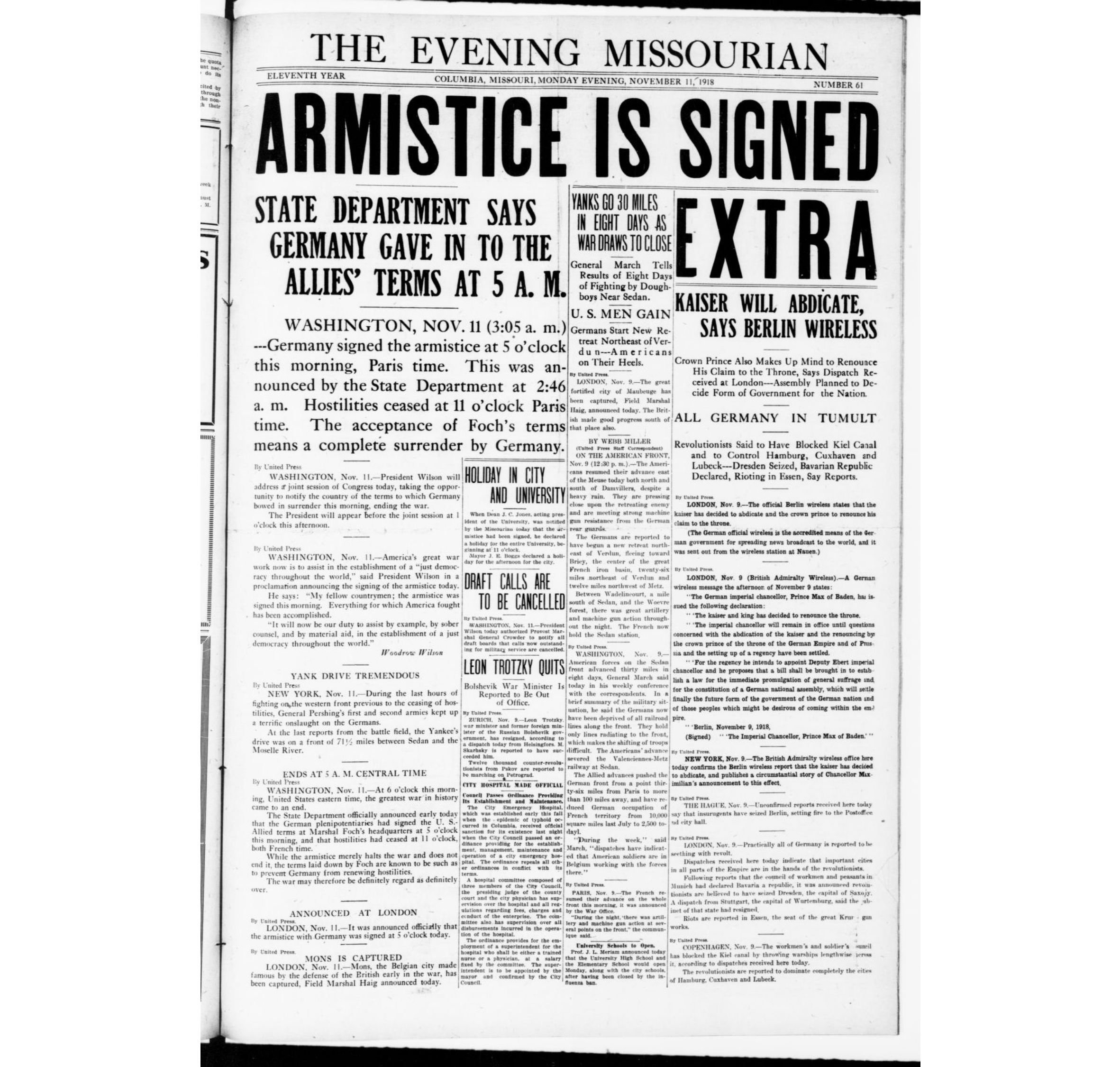 The Evening Missourian. [volume] (Columbia, Mo.), 11 Nov. 1918. Chronicling America: Historic American Newspapers. Lib. of Congress.