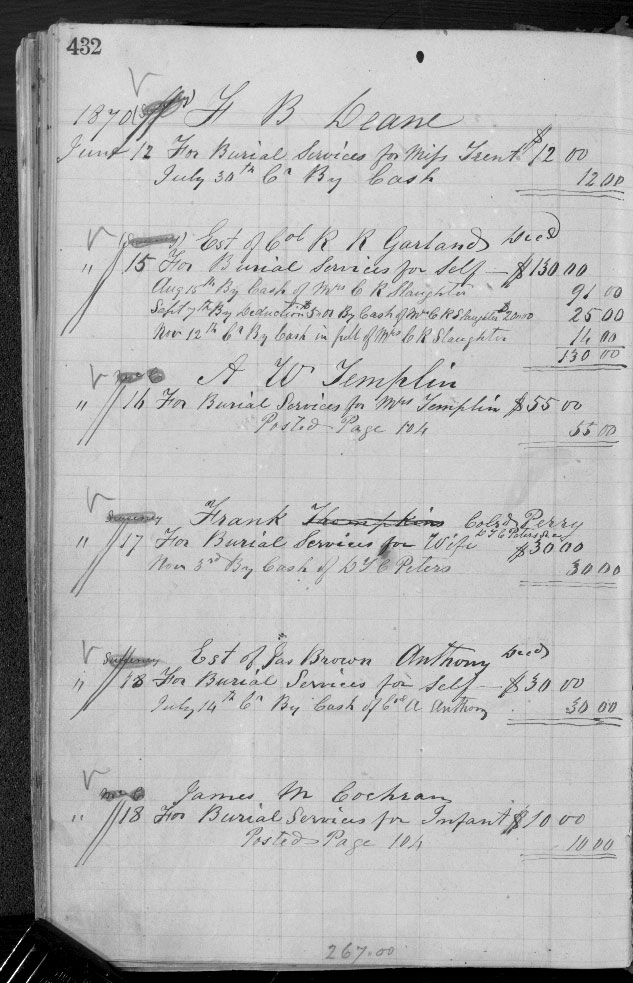 The cost of funerals in 1870 varied, as evidenced by this ledger. Notice that according to this particular page, that funerals cost anywhere from $30 to $75. Is this the typical range of pricing for funerals? Another page from the same year shows us that no, this is not the typical range of funeral prices. The ledger below shows that the price ranges from $10 to $130 for Col. R.R. Garland.[12]
