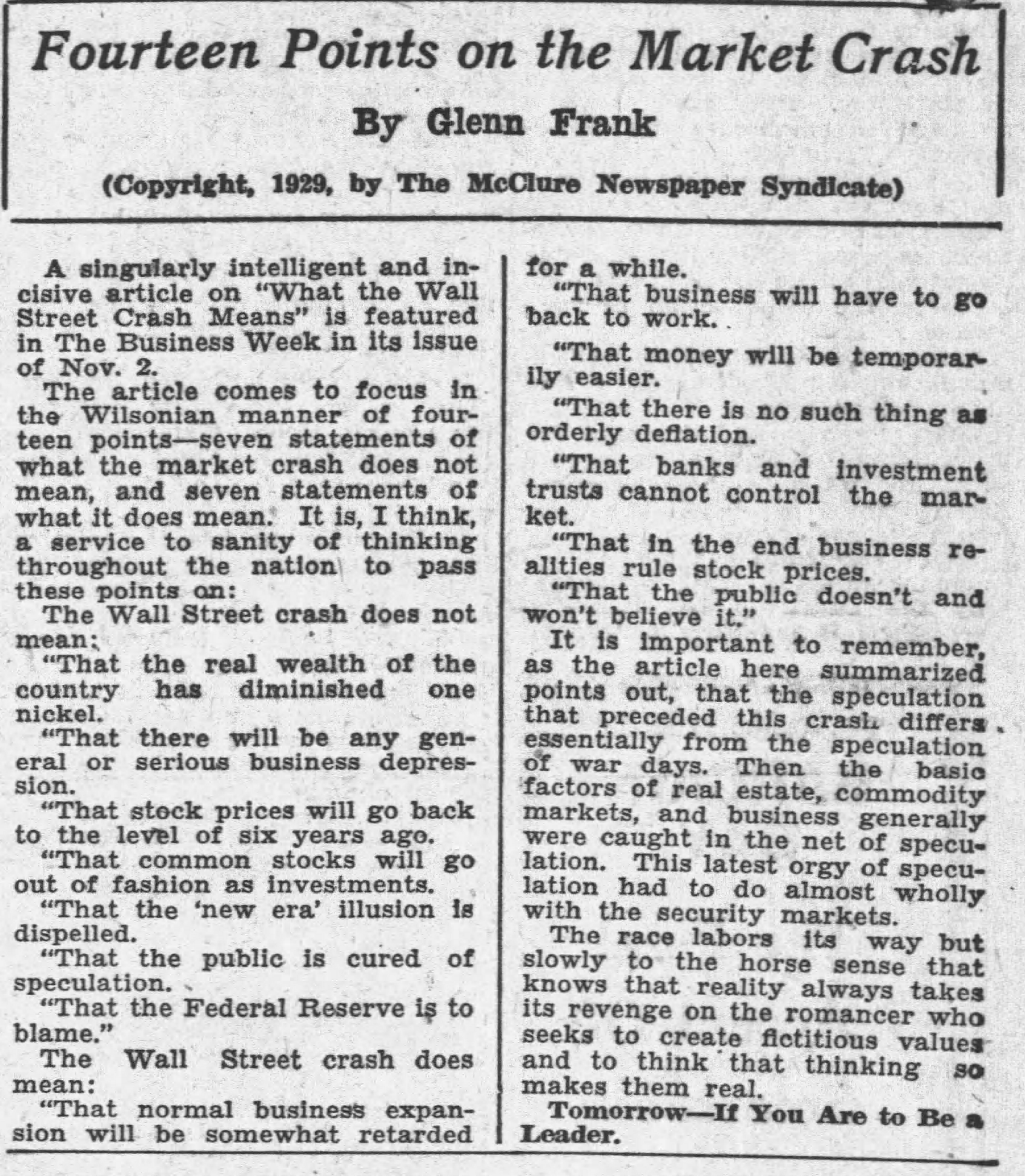 Frank, Glenn. “Fourteen Points on the Market Crash.” St. Louis Post Dispatch. October 25, 1929.