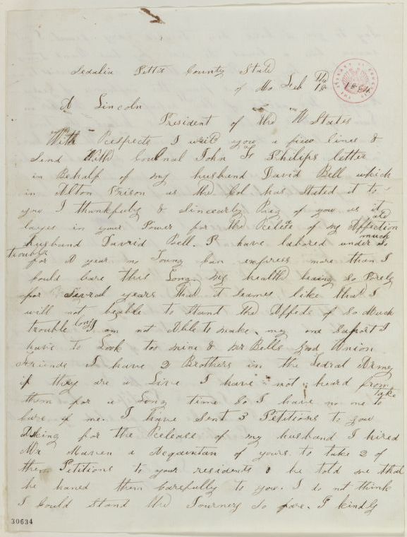 Letter from Partillia E. Bell to Abraham Lincoln, Thursday, February 18, 1864 seeking her husband’s release from Alton Prison. Image from the Library of Congress.