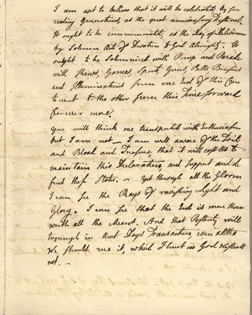 “I am apt to believe that it will be celebrated by succeeding Generations as the great anniversary Festival. It ought to be commemorated, as the Day of Deliverance, by solemn Acts of Devotion to God Almighty. It ought to be solemnized with Pomp and Parade, with Shews, Games, Sports, Guns, Bells, Bonfires and Illuminations from one End of this Continent to the other from this Time forward forever more. You will think me transported with Enthusiasm but I am not. — I am well aware of the Toil and Blood and Treasure, that it will cost Us to maintain this Declaration, and support and defend these States. — Yet through all the Gloom I can see the Rays of ravishing Light and Glory. I can see that the End is more than worth all the Means. And that Posterity will tryumph in that Days Transaction, even altho We should rue it, which I trust in God We shall not.”[3]